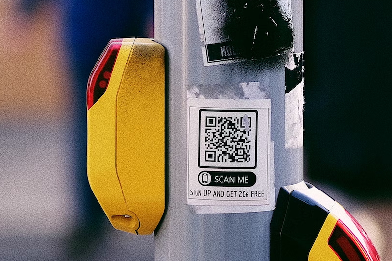 - Te topas con un QR pegado en un poste, un parquímetro, una pared, un folleto o incluso en una mesa de café.