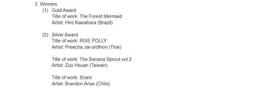 Este año hubo 716 inscripciones de 95 países y regiones, lo que supuso un récord para la organización. Sin embargo, pese a la dura competencia, el chileno Brandon Arias logró imponerse y obtener el Premio de Plata por su obra Scars (Cicatrices).