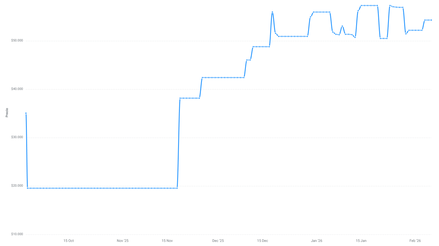 Evolución del precio de A-DATA XPG Lancer Blade RGB AX5U6000C3616G-SLABRBK (1 x 16 GB DDR5-6000) (Gráfico elaborado por Solotodo)