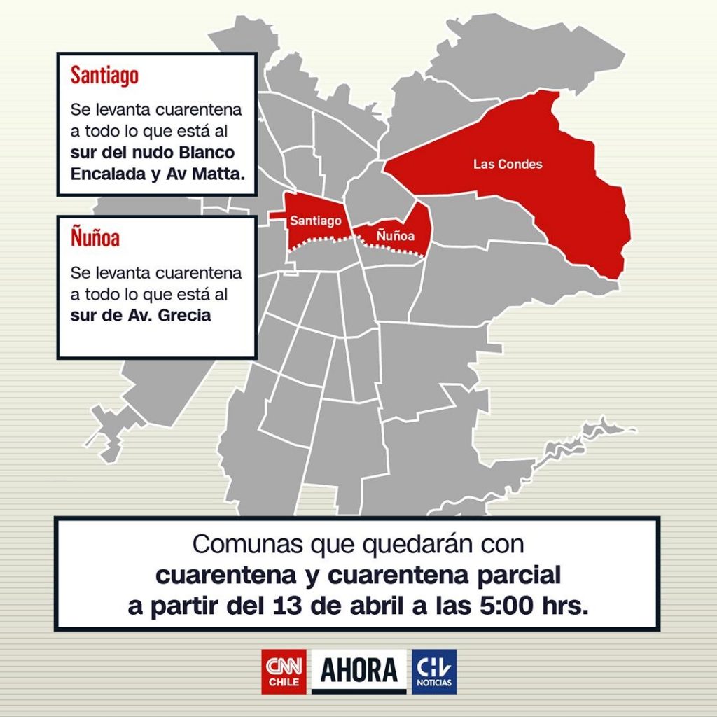 Lo Barnechea, Vitacura, Providencia, mitad sur de Ñuñoa (Av Grecia al sur) y al sur de Av. Matta y Blanco Encalada en comuna de Stgo pic.twitter.com/6bXRKArfXM— Ministerio de Salud (@ministeriosalud) April 7, 2020