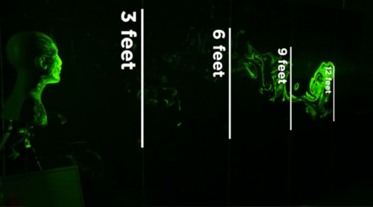 Las gotas expulsadas viajan una distancia de 0,9 metros casi inmediatamente. En los próximos cinco segundos las gotitas alcanzan los 1,83 metros y los 2,74 metros en sólo 10 segundos.