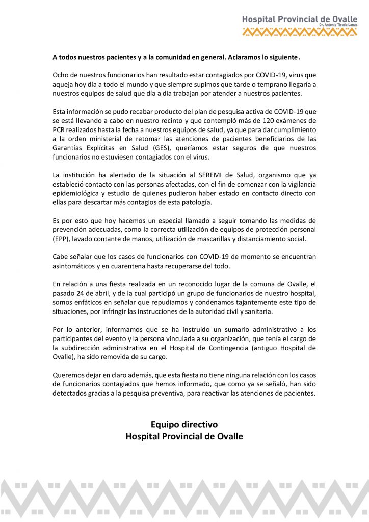 Asimismo, aclara que los trabajadores contagiados no tienen relación con la fiesta mencionada anteriormente y afirma que “han sido detectados gracias a la pesquisa preventiva, para reactivar las atenciones de pacientes”.