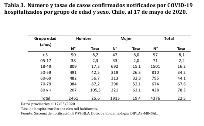 Al 17 de mayo se contabilizaba un total de 4.376 hospitalizados. Los mayores de 80 años representan una tasa de hospitalización de 78,3 por 100 mil habitantes, mientras que los mayores de edad entre 70 y 79 años presentan una tasa de 67,6.