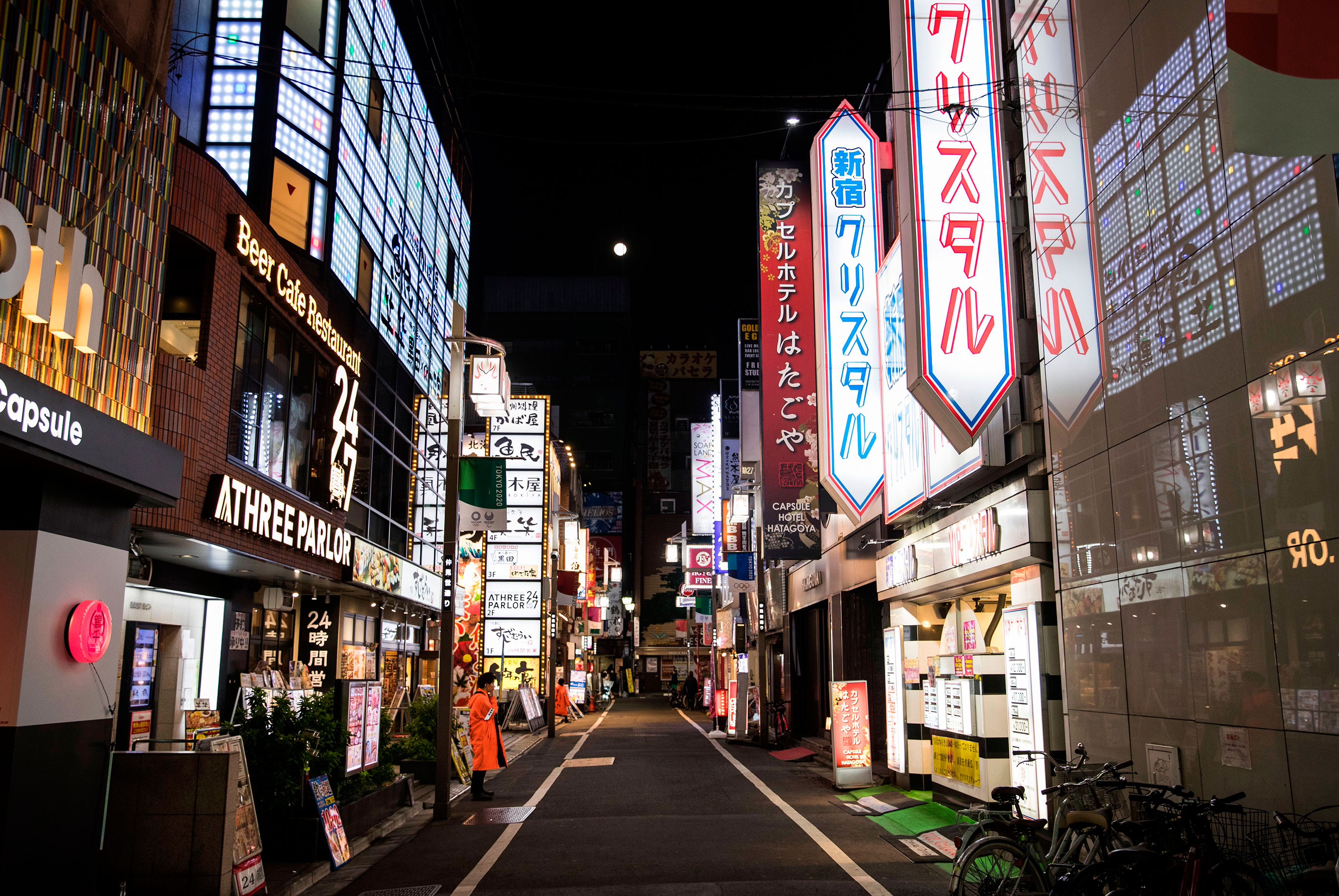 A general view shows an empty street of at Tokyo’s entertainment district of Kabukicho on April 7, 2010. – Japan’s Prime Minister Shinzo Abe on April 7 declared a month-long state of emergency in Tokyo and six other parts of the country over a spike in coronavirus cases. (Photo by Behrouz MEHRI / AFP) (Photo by BEHROUZ MEHRI/AFP via Getty Images)