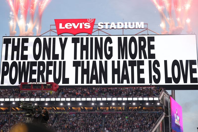 Un letrero que dice “Lo único más poderoso que el odio es el amor” se muestra en el marcador durante el espectáculo de medio tiempo del Apple Music Super Bowl LX en el Levi’s Stadium el 08 de febrero de 2026 en Santa Clara, California. Kevin C. Cox/Getty Images North America/Getty Images