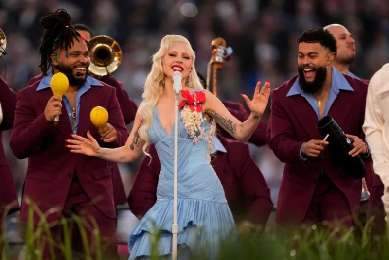Lady Gaga se unió a Bad Bunny en el escenario para actuar durante el medio tiempo del Super Bowl LX. Brynn Anderson/AP