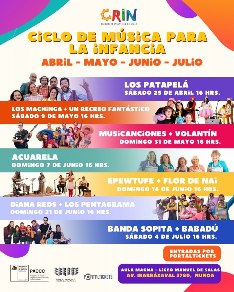 La Asociación Gremial de Creadores Infantiles (CRIN Chile) anunció una temporada de conciertos para público familiar en el Teatro Aula Magna del Liceo Manuel de Salas, en Ñuñoa.