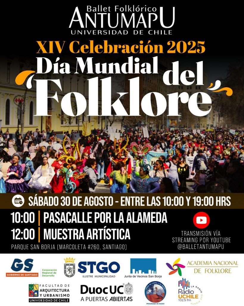 El próximo sábado 30 de agosto, Santiago será escenario de la XIV versión del Día Mundial del Folklore, una celebración que reunirá a más de dos mil artistas en el tradicional pasacalle por la Alameda y que continuará con un evento central en el Parque San Borja.