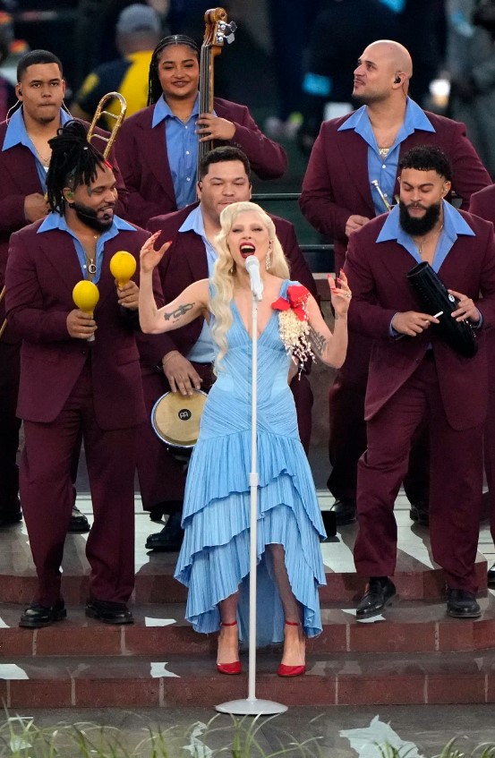 El momento más viral del Super Bowl: Lady Gaga sorprende con un traje azul frente a una orquesta tropical antes de bailar junto a Bad Bunny. PATRICK T. FALLON/AFP/AFP via Getty Images