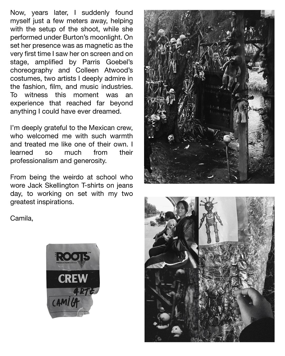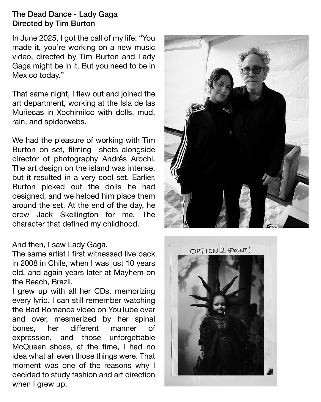 “En junio de 2025, recibí la llamada de mi vida: ‘Lo has conseguido, vas a trabajar en un nuevo videoclip dirigido por Tim Burton y en el que podría participar Lady Gaga. Pero tienes que estar en México hoy mismo’”, relató Camila sobre cómo comenzó su travesía. Sin pensarlo, agarró su maleta y tomó un vuelo hacia la Isla de las Muñecas en Xochimilco, donde trabajó con muñecas, barro, lluvia y telarañas.