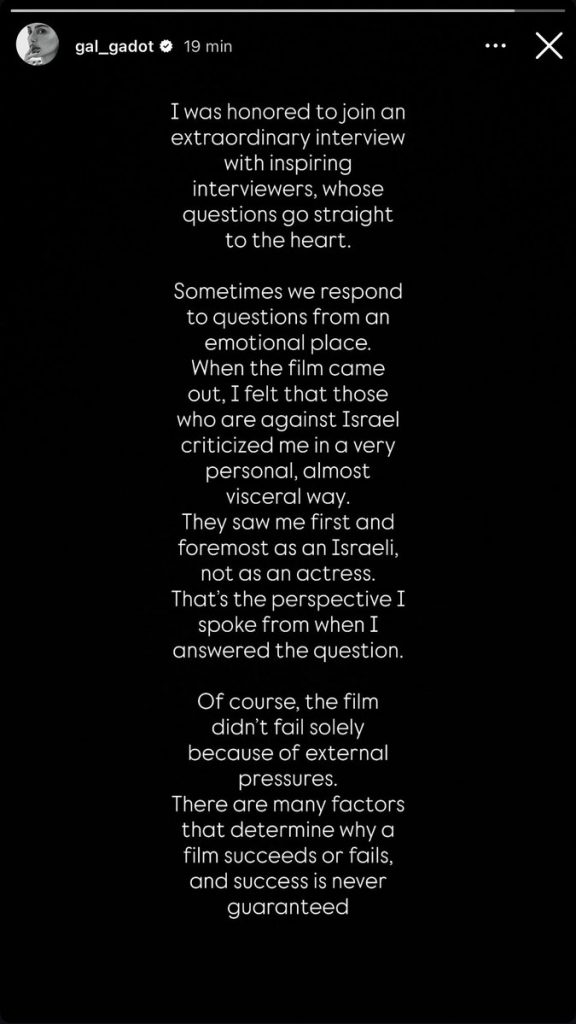 Tras la polémica nacida por una entrevista en la que la actriz vinculó los malos resultados del filme con la presión hacia celebridades para pronunciarse contra Israel, aclaró a través de redes sociales que sus palabras fueron “emocionales” y reconoció que “el éxito nunca está garantizado” en la industria.