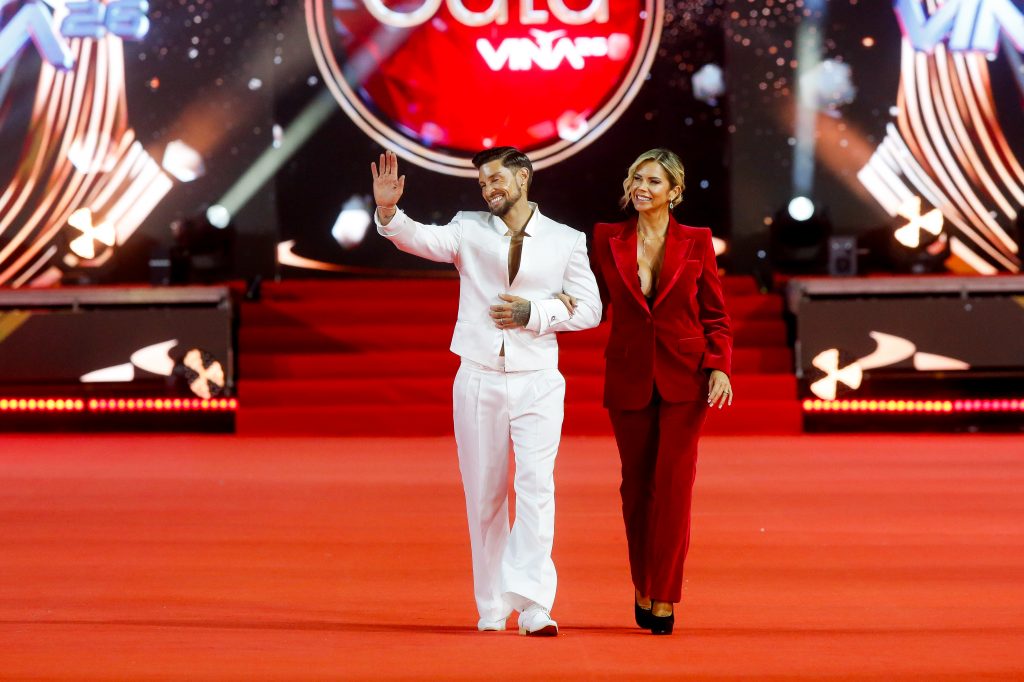 La alcaldesa Macarena Ripamonti, junto al animador Jose Antonio Neme, en la alfombra roja de la Gala del festival de Viña del Mar 2026,