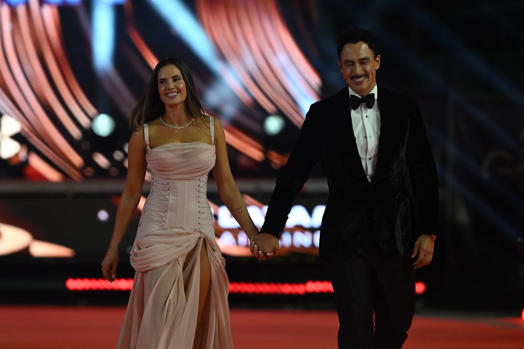 Daniela Aranguiz y Jose Manuel “Cuco” Cerda caminan por la alfombra roja de la Gala del festival de Viña del Mar 2026,