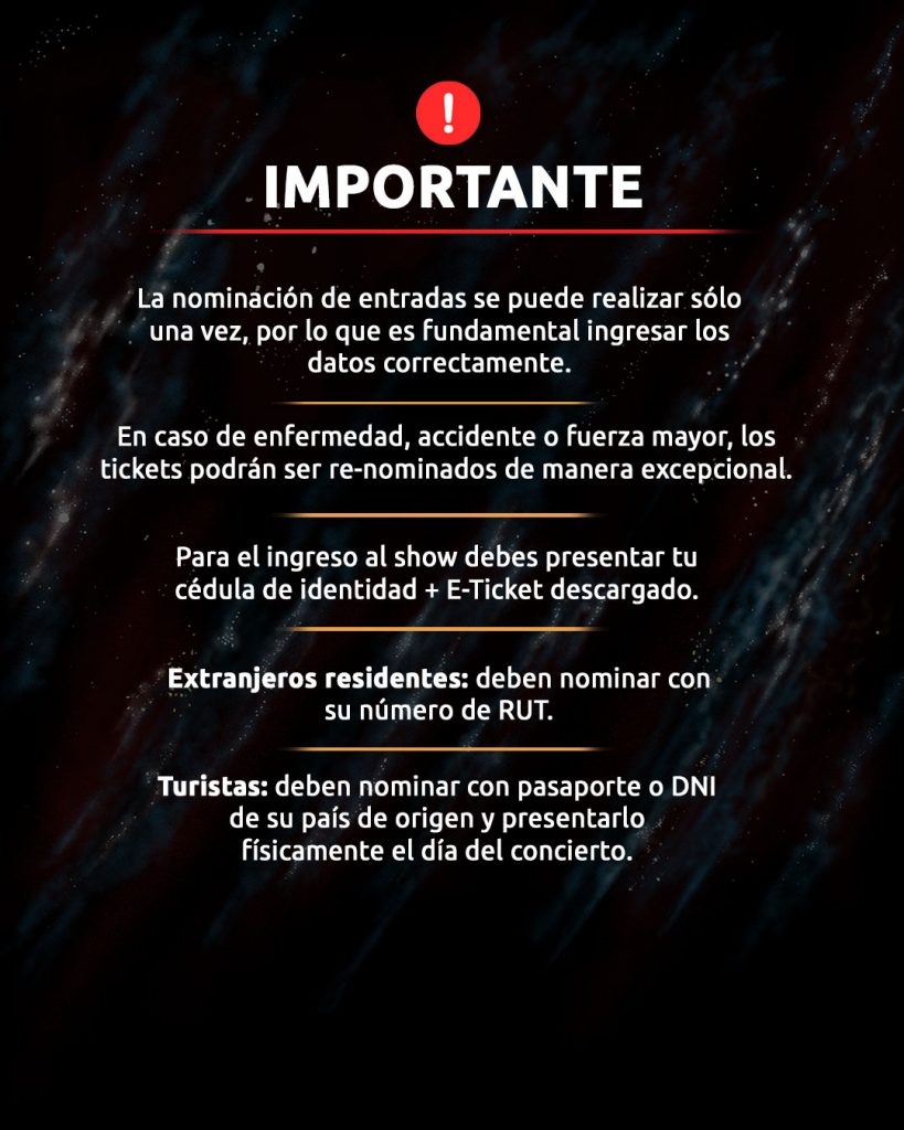 El proceso debe completarse con el nombre completo, RUT, fecha de nacimiento, correo electrónico, teléfono y comuna del asistente. La productora enfatizó que cada ticket solo podrá ser nominado una vez, por lo que recomienda revisar cuidadosamente la información antes de enviarla.