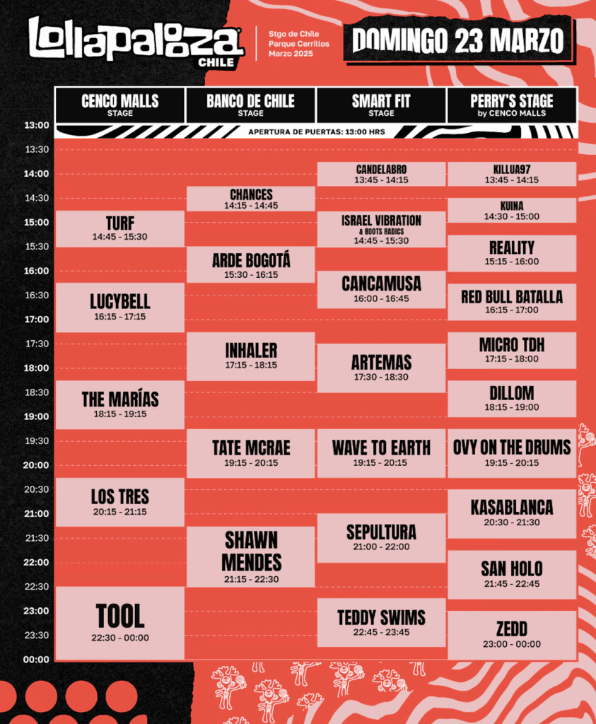 Para el cierre del evento, el domingo 23 de marzo, Tool será el acto principal en el Cenco Malls Stage a las 22:30 horas.