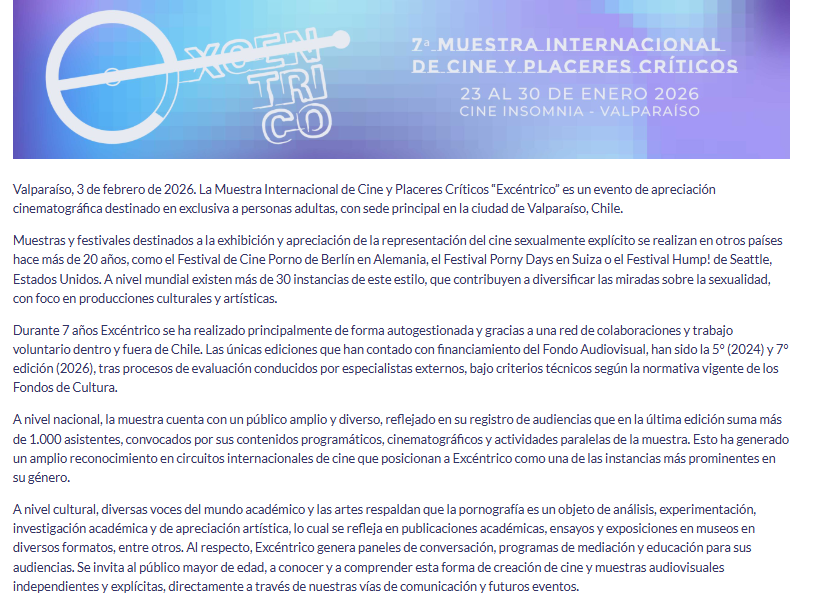 Respecto de los cuestionamientos, la organización respondió que la Muestra Internacional de Cine y Placeres Críticos Chile se realiza desde hace siete años de “forma autogestionada y gracias a una red de colaboraciones y trabajo voluntario dentro y fuera de Chile”.