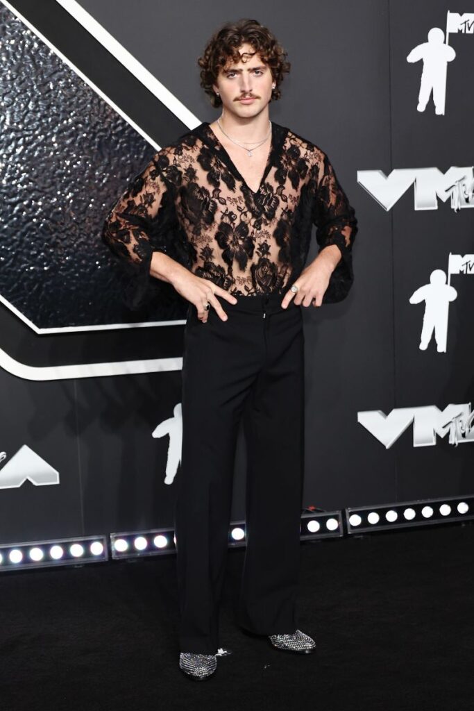 La alfombra roja de este año fue, de hecho, negra, y muchas estrellas llegaron con tonos oscuros y looks de inspiración gótica. Suki Waterhouse y Margaret Qualley, vestidas de Dolce & Gabbana y Chanel respectivamente, optaron por elegantes (y, en sus casos, plumíferos) vestidos negros. La cantante Benson Boone lució un top negro transparente con encaje y calzado adornado.