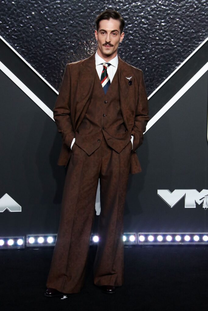 Damiano David, de Måneskin, lució un traje de tres piezas de jacquard, con pantalones de pernera ancha y solapas de pico, de la marca italiana Etro. Matt Baron/BEI/Shutterstock vía CNN Newsource