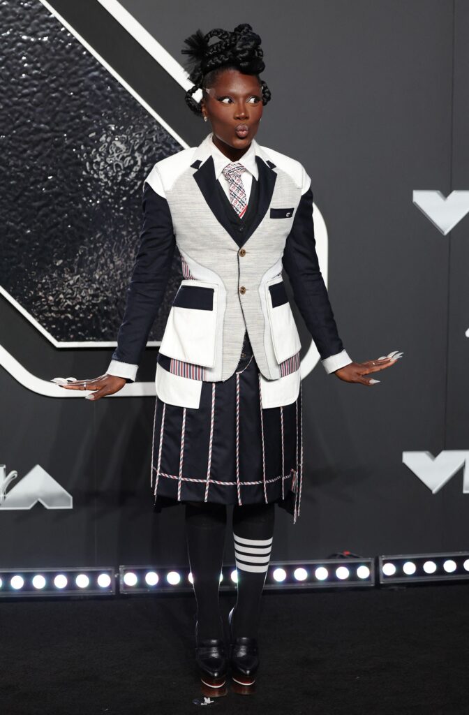 Doechii con un traje de Thom Browne con el motivo de cuatro rayas característico del diseñador. Andrew Kelly/Reuters vía CNN Newsource