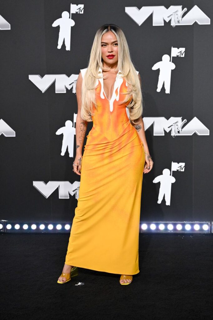 Maxivestido estampado de llamas de la cantante colombiana Karol G. Gilbert Flores/Billboard/Getty Images vía CNN Newsource