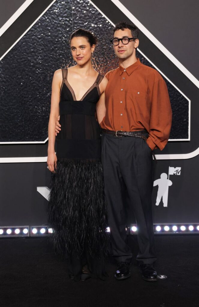 Margaret Qualley, posando con su marido Jack Antonoff, lució un vestido de Chanel de gasa negra con plumas, inspirado en un modelo de la colección de Alta Costura Otoño-Invierno 1995/96 de la firma. Andrew Kelly/Reuters vía CNN Newsource
