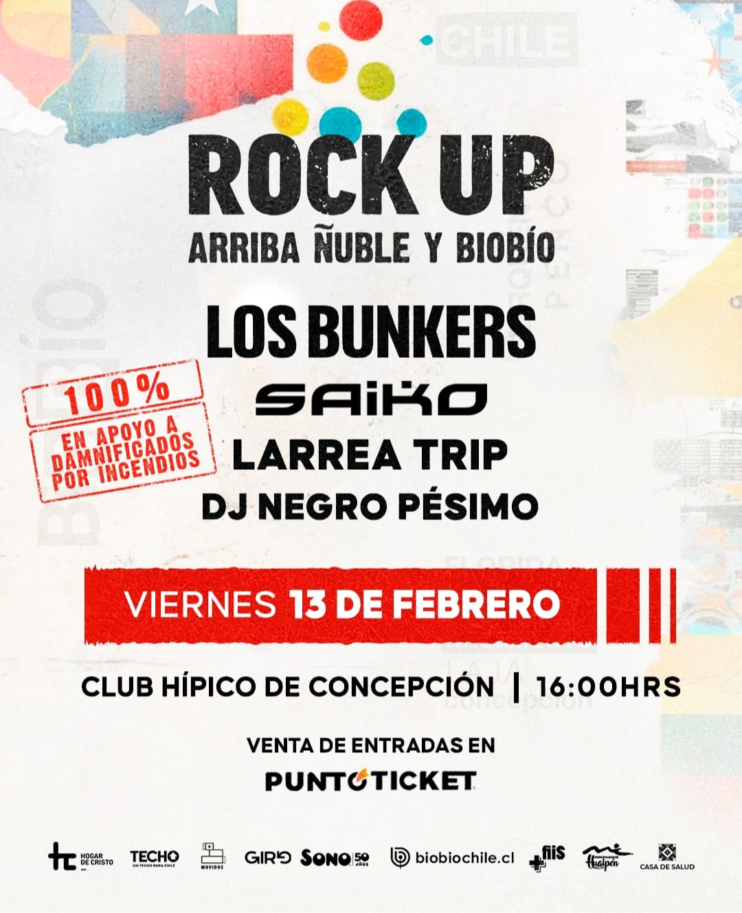 Este contará con la participación de Los Bunkers, Saiko, Larrea Trip y DJ Negro Pésimo, quienes al igual que los organizadores, no cobrarán honorarios de manera tal que todos los recursos que se reúnan vayan íntegramente a las familias afectadas.
