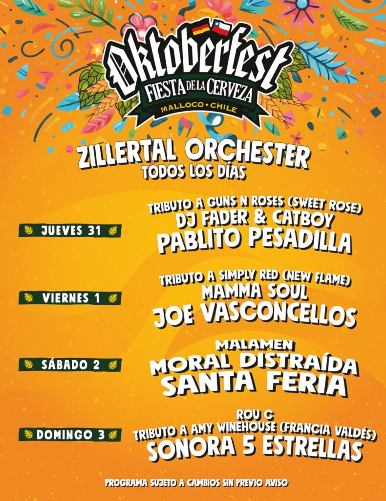 El evento, que se desarrollará del 31 de octubre al 3 de noviembre en el Centro de Eventos Múnich de Malloco, contará con las presentaciones de artistas de la talla de Pablito Pesadilla, Joe Vasconcellos, Santa Feria y Sonora 5 Estrellas, quienes darán vida a un festival cargado de música, cultura y tradición bávara.