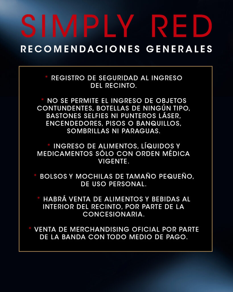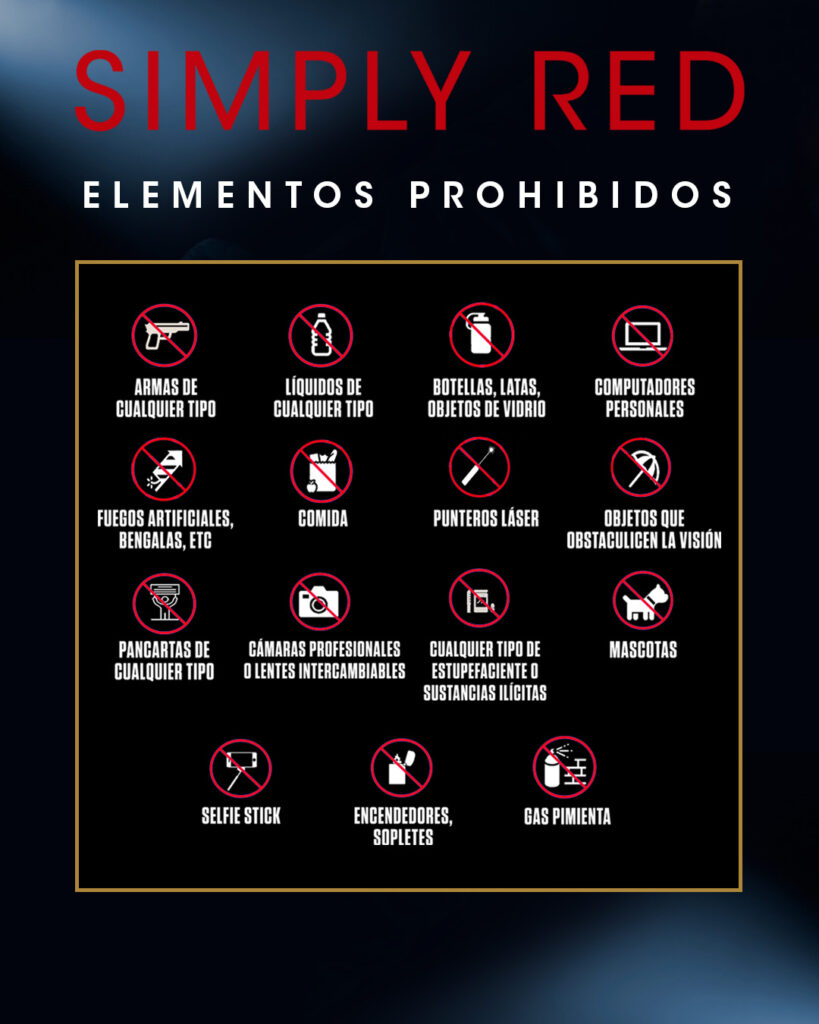 Los organizadores han informado que no se permitirá el ingreso de objetos contundentes, armas, líquidos, botellas, latas, fuegos artificiales, cámaras profesionales, entre otros elementos.
