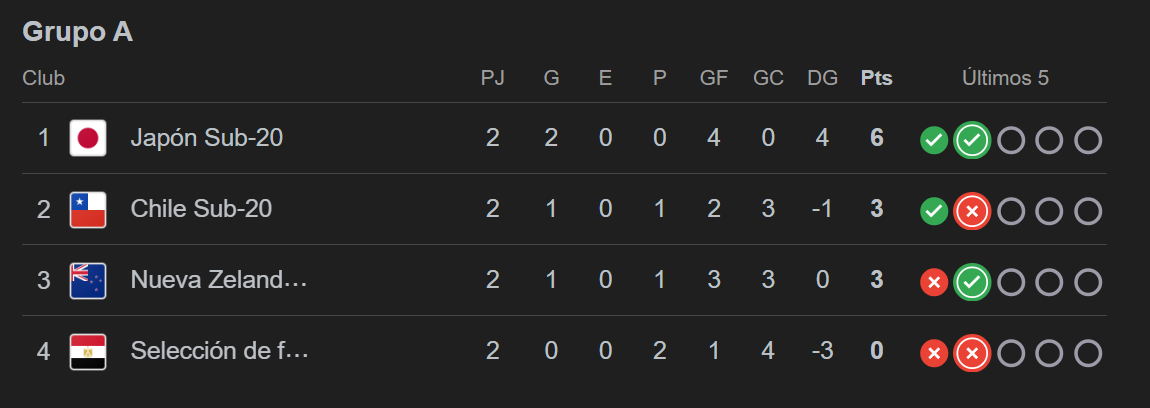 Japón lidera con 6 unidades y ya tiene asegurado su boleto a octavos. Más atrás aparecen Nueva Zelanda y Chile con 3 puntos; sin embargo, los neozelandeses presentan diferencia de gol neutra (0), mientras que el anfitrión queda con -1. Egipto, sin unidades, cierra la zona.