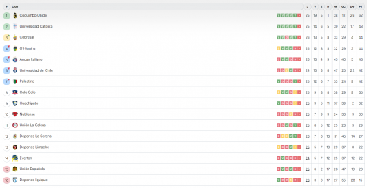 La tabla de posiciones continúa siendo liderada por Coquimbo Unido, que se consolida en la cima con 62 puntos. Más atrás le siguen Universidad Católica con 44, mientras que en la zona baja, Deportes Iquique se mantiene último con 15 unidades y arriesga un inminente descenso.