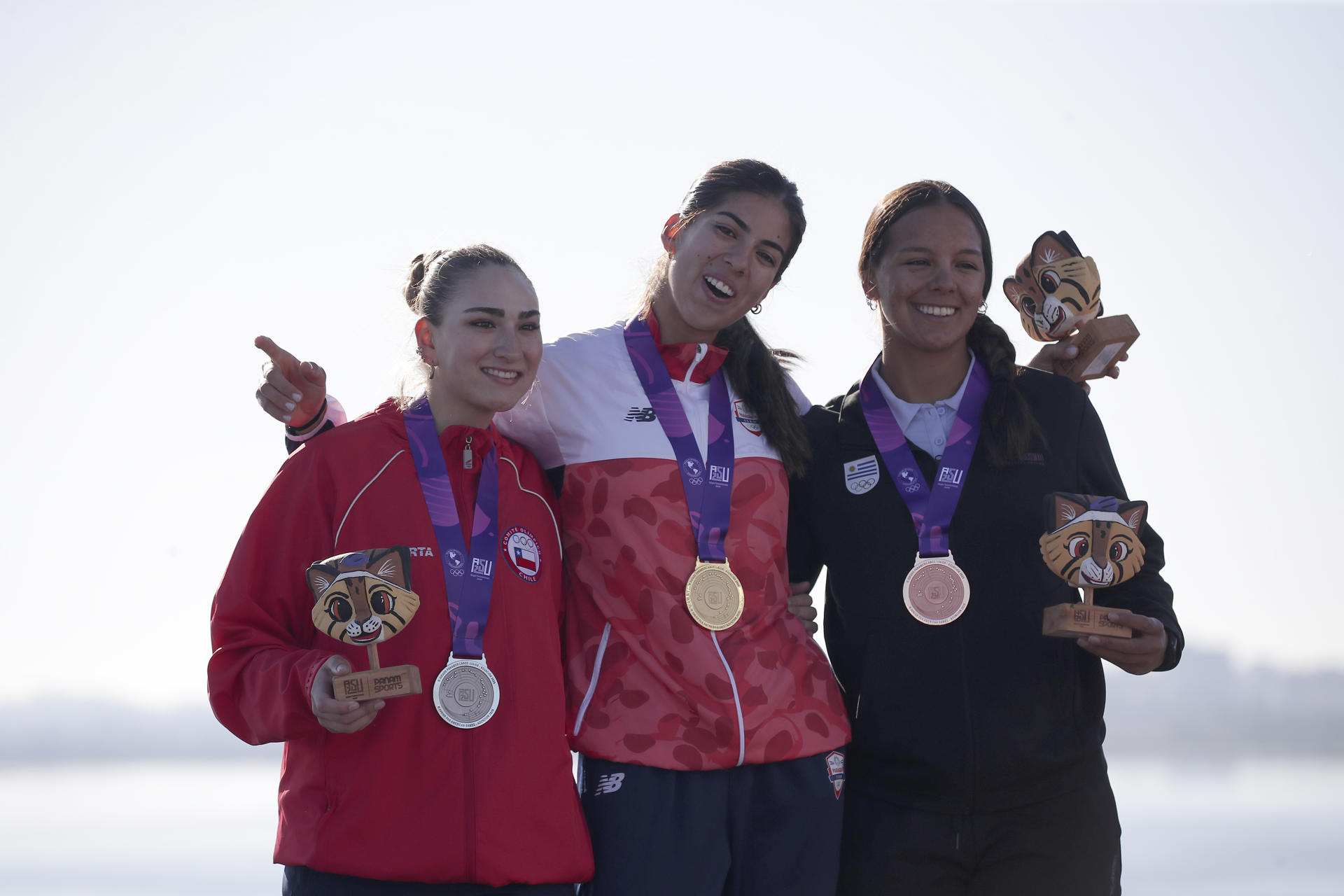 El podio final de la categoría de remo corto femenino de los II Juegos Panamericanos Junior quedó formado este domingo por la chilena Felipa Rosas (i), ganadora de la medalla de plata; la paraguaya Nicole Martínez (c), que se alzó con el oro; y la uruguaya Cloe Callorda, que se colgó el bronce en la bahía de Asunción. EFE/Juan Pablo Pino.