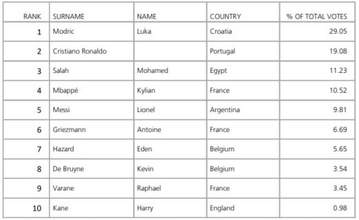 Así fue la votación por el mejor jugador de 2018, quedando entre el top 5, además de Modric, Cristiano Ronaldo, Mohamed Salah, Kylian Mbappé y por último, Lionel Messi.