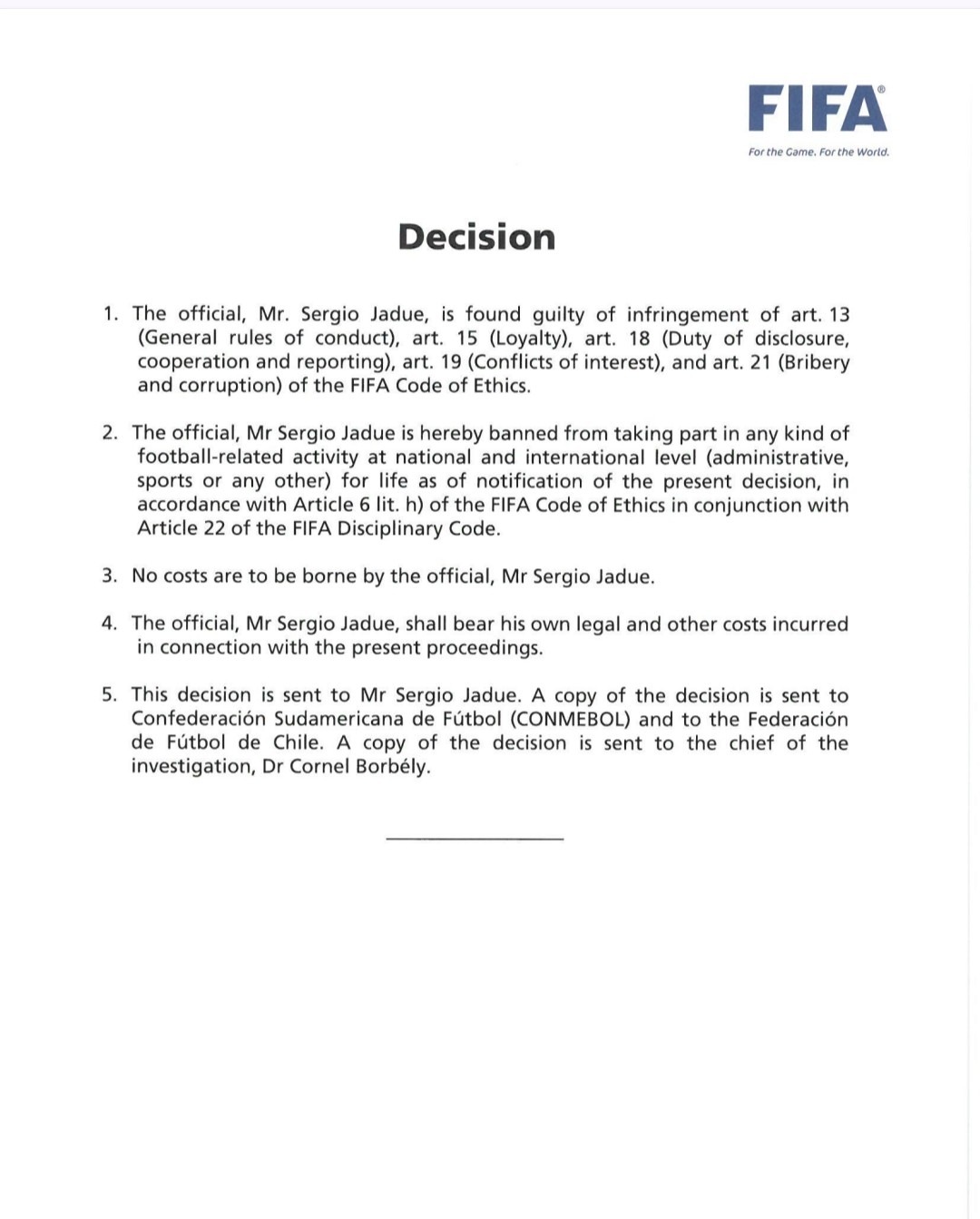 El documento —bajo el directo titular Decision— declara a Jadue culpable de infringir los artículos 13 (reglas generales de conducta), 15 (lealtad), 18 (deber de informar y cooperar), 19 (conflictos de interés) y 21 (soborno y corrupción) del Código de Ética de FIFA.