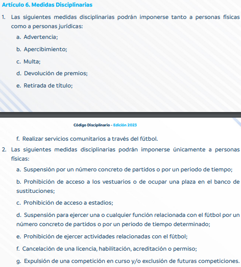 Según el artículo 6 del Código, también podría enfrentar suspensiones por un número específico de partidos o un periodo determinado, junto con la prohibición de acceso a estadios y la suspensión de sus funciones relacionadas con el fútbol.