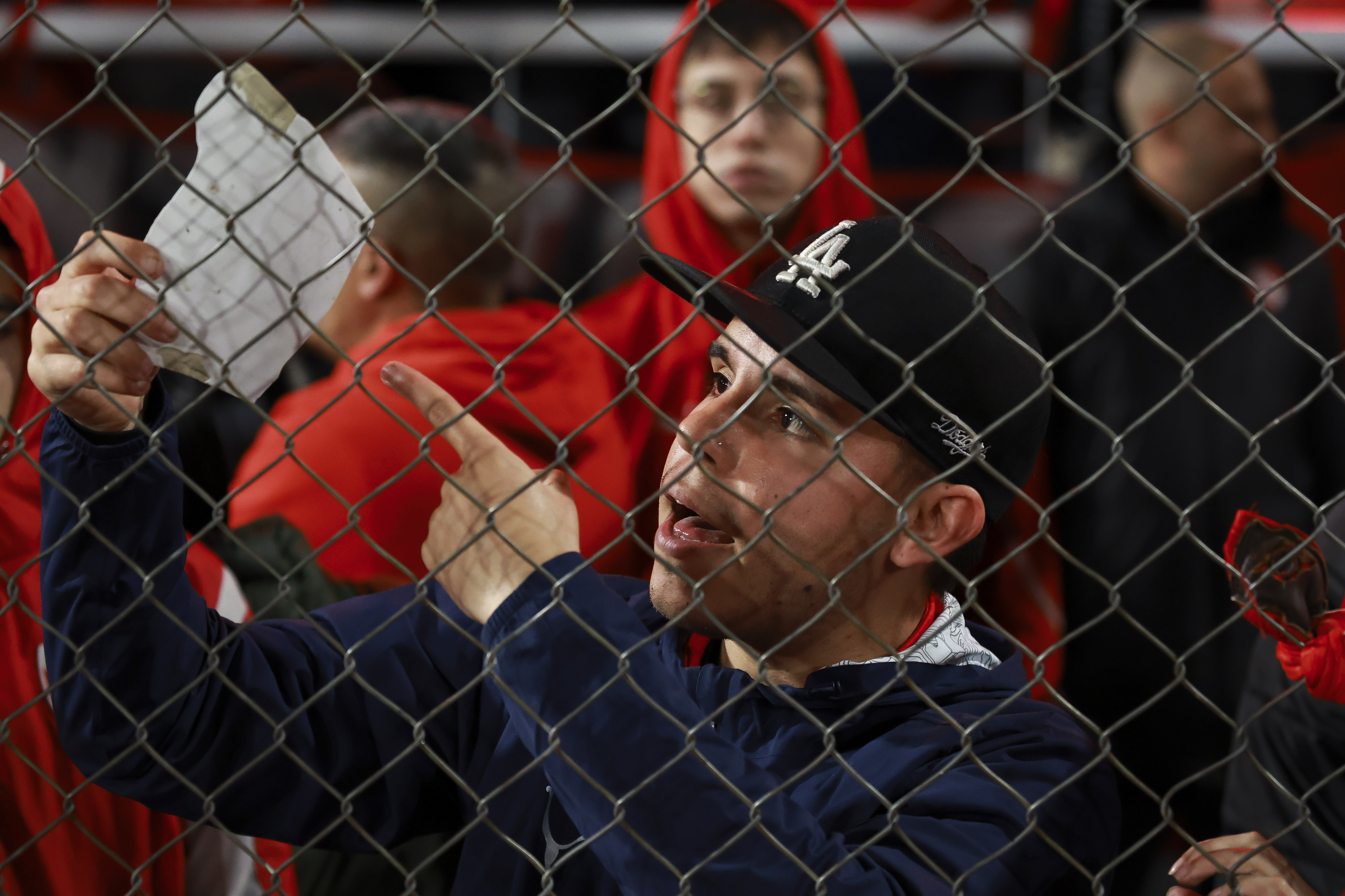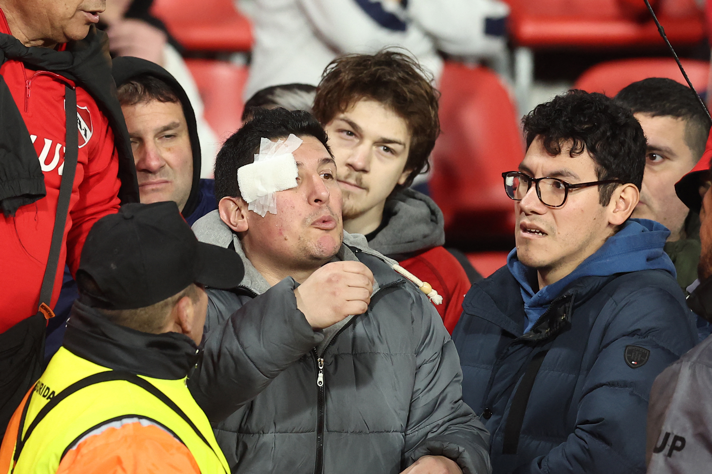 A man with a bandage on his face gestures during the interruption of the Copa Sudamericana round of 16 second leg football match between Argentina’s Independiente and Chile’s Universidad de Chile at the Libertadores de America stadium in Avellaneda, Buenos Aires province, Argentina on August 20, 2025. (Photo by Alejandro PAGNI / AFP)