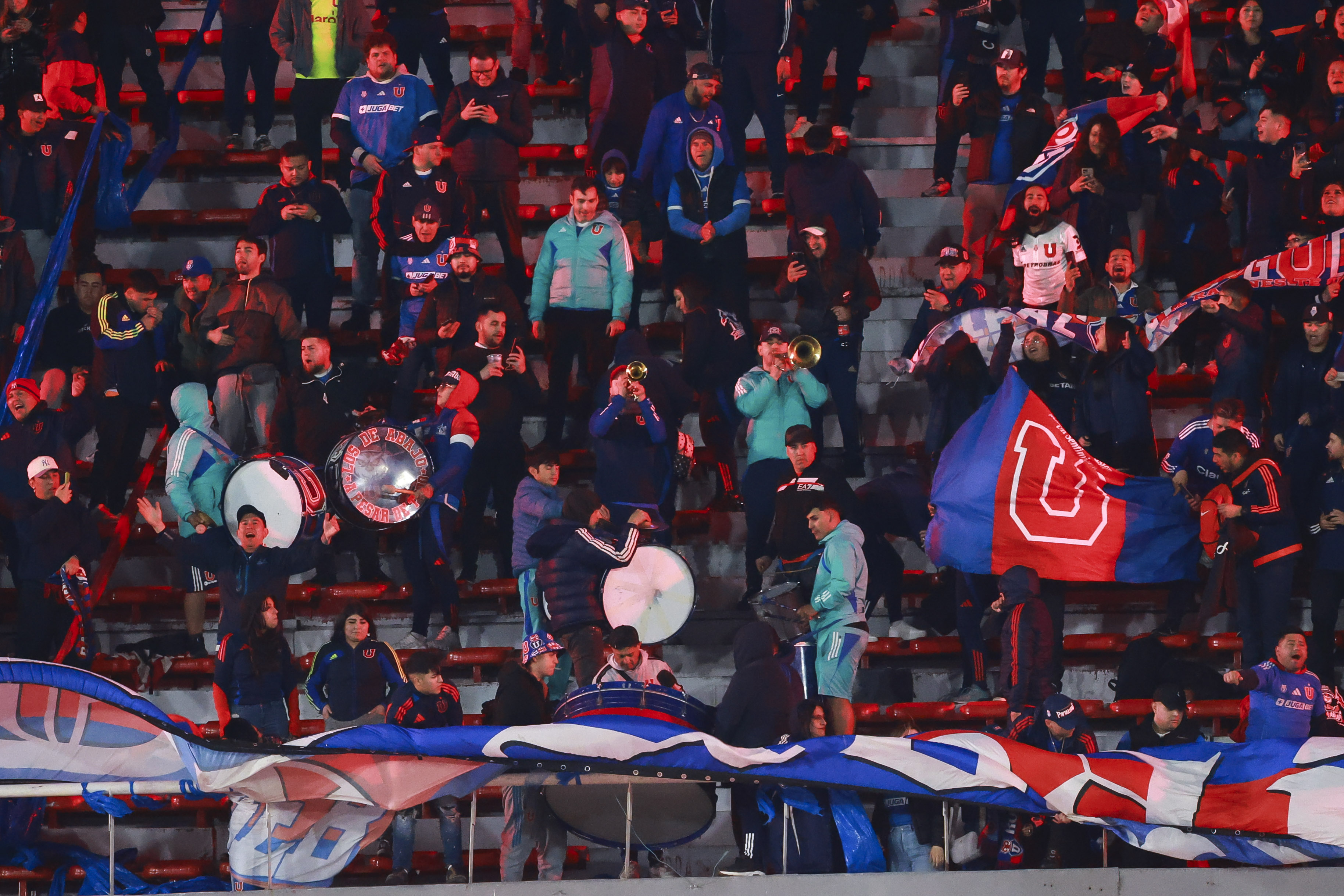 Hinchas de Universidad de Chile ingresan a la galería, durante el partido valido por los Octavos de final vuelta de la Copa CONMEBOL Sudamericana 2025, entre Independiente vs Universidad de Chile, disputado en el Estadio Libertadores de América.
