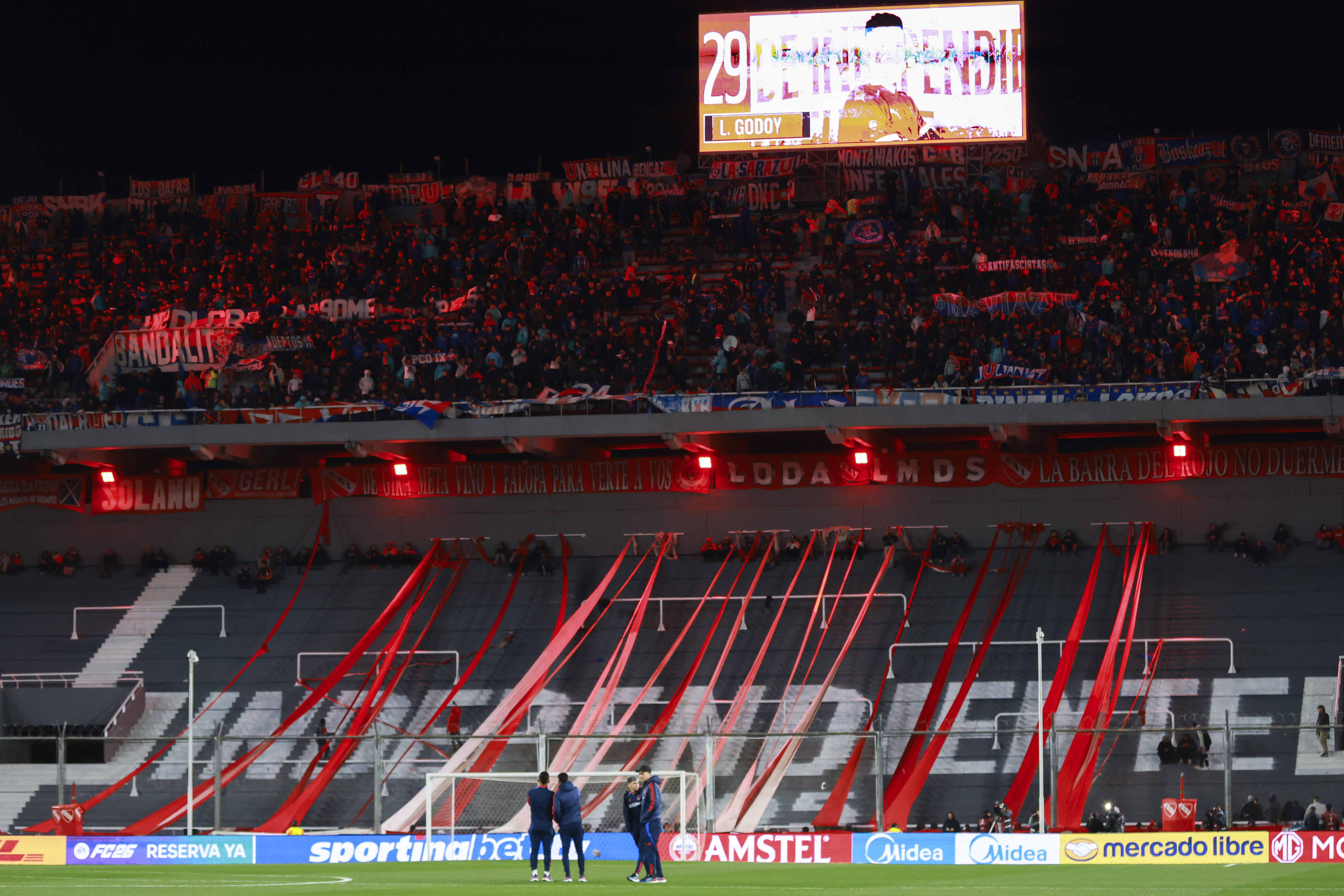 AMDEP1476. AVELLANEDA (ARGENTINA), 20/08/2025.- Hinchas se enfrentan este miércoles, en un partido de los octavos de final de la Copa Sudamericana entre Independiente y Universidad de Chile en el estadio Libertadores de América en Avellaneda (Argentina). EFE/ Juan Ignacio Roncoroni