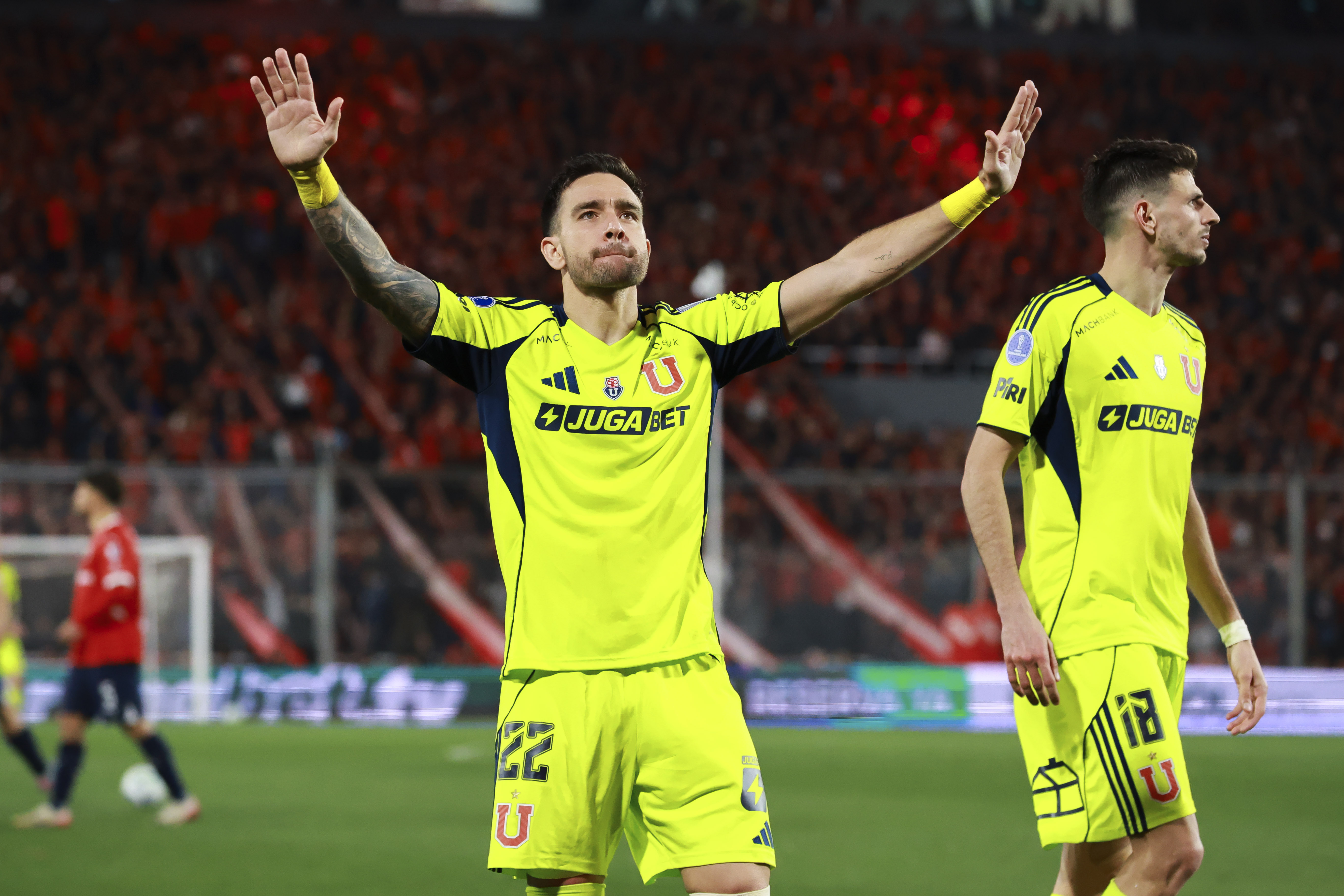 Jugadores de Universidad de Chile les pide control a sus hinchas por incidentes con la barra de Independiente, durante el partido valido por los Octavos de final vuelta de la Copa CONMEBOL Sudamericana 2025, entre Independiente vs Universidad de Chile, disputado en el Estadio Libertadores de América.