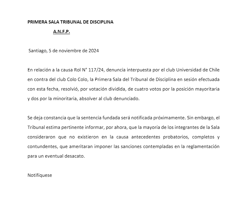 Aunque el fallo definitivo y sus fundamentos serán notificados en los próximos días, el Tribunal adelantó que la mayoría de sus integrantes consideraron que las pruebas aportadas por Universidad de Chile no eran suficientes ni concluyentes para justificar las sanciones contempladas en el reglamento por desacato.