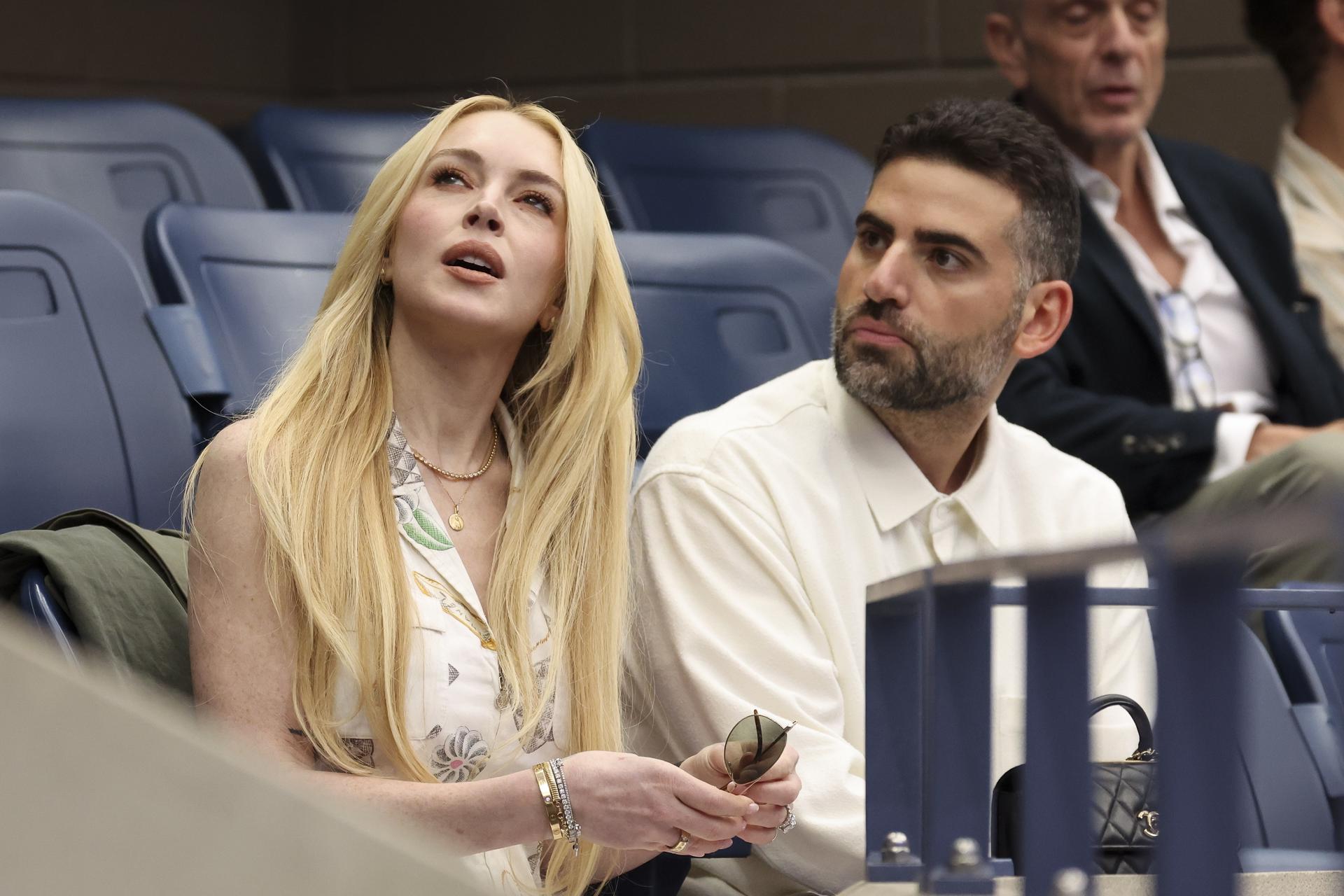 La actriz estadounidense Lindsay Lohan (izquierda) y su marido, Bader Shammas, asisten a la final masculina individual del Abierto de Estados Unidos de tenis en el Centro Nacional de Tenis Billie Jean King de la USTA en Flushing Meadows, Nueva York, Estados Unidos, el 7 de septiembre de 2025. (Tenis, Nueva York) EFE/EPA/SARAH YENESEL