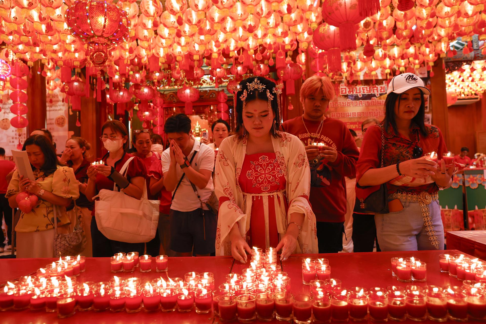 BANGKOK (Tailandia), 16/02/2026.- Una mujer tailandesa enfundada en un vestido tradicional chino reza y enciende velas para marcar el inicio del Año Nuevo lunar en el Templo del Loto del Dragón del barrio chino de Bangkok. EFE/EPA/RUNGROJ YONGRIT