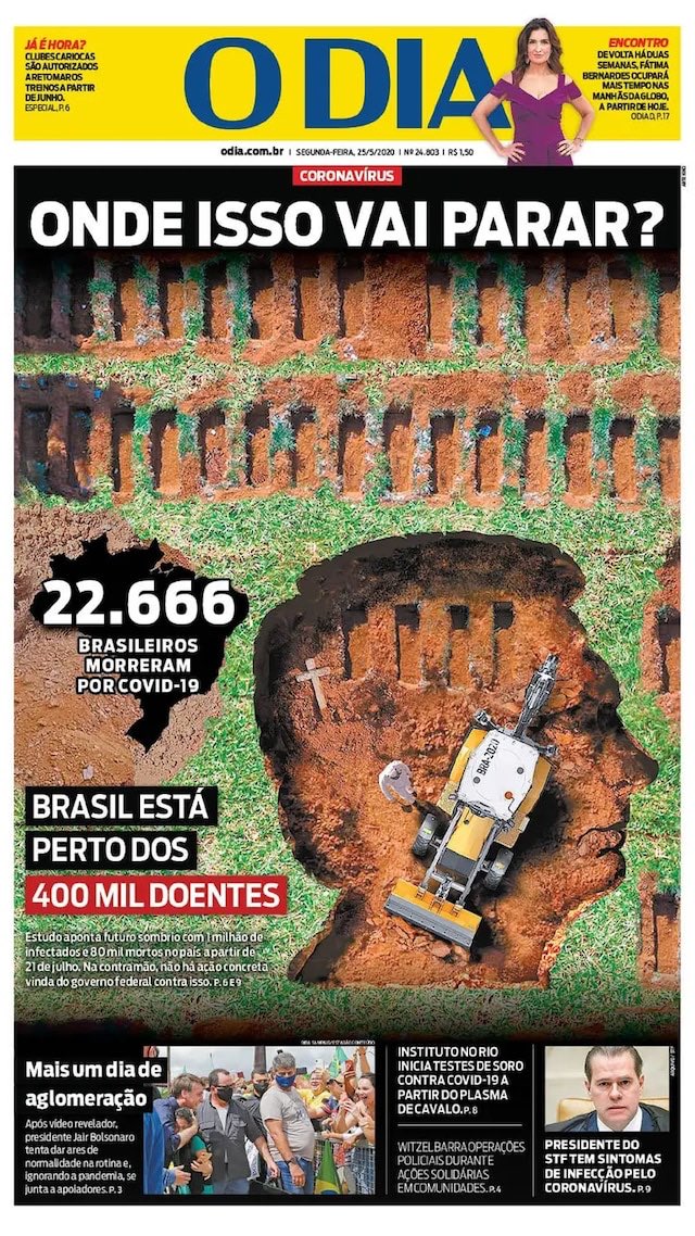 El periódico con base en Río de Janeiro destacó en su portada que 22.666 brasileños han muerto producto del virus. Esto junto a una imagen de la silueta del mandatario con fosas para los cadáveres.