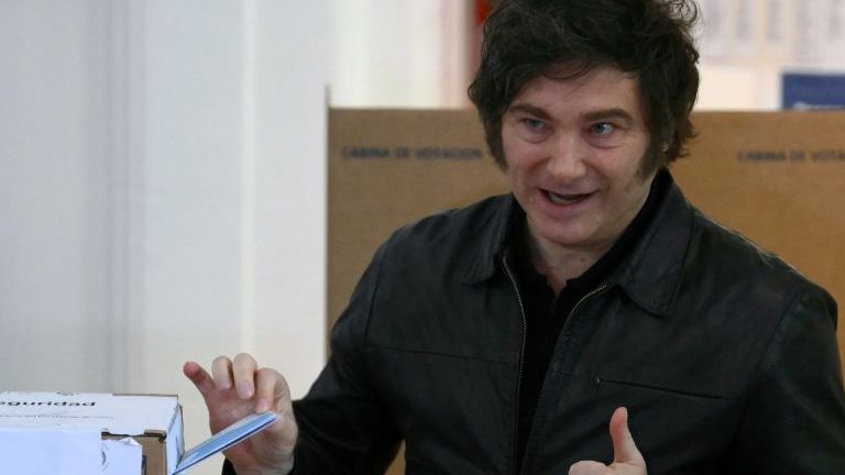 El presidente de Argentina, Javier Milei, posa para una foto antes de emitir su voto en un colegio electoral durante las elecciones legislativas de mitad de período en Buenos Aires el 26 de octubre de 2025. LUIS ROBAYO/AFP/AFP via Getty Images