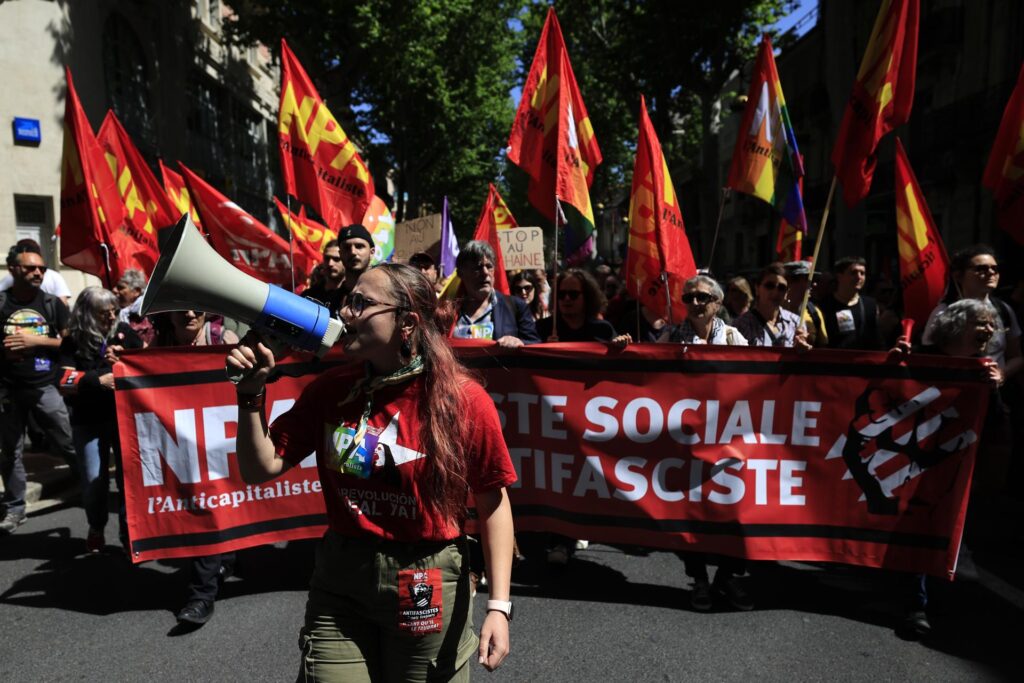 Miembros de los sindicatos franceses participan en la marcha anual del Primero de Mayo en Narbona, Francia, este jueves. EFE/EPA/GUILLAUME HORCAJUELO