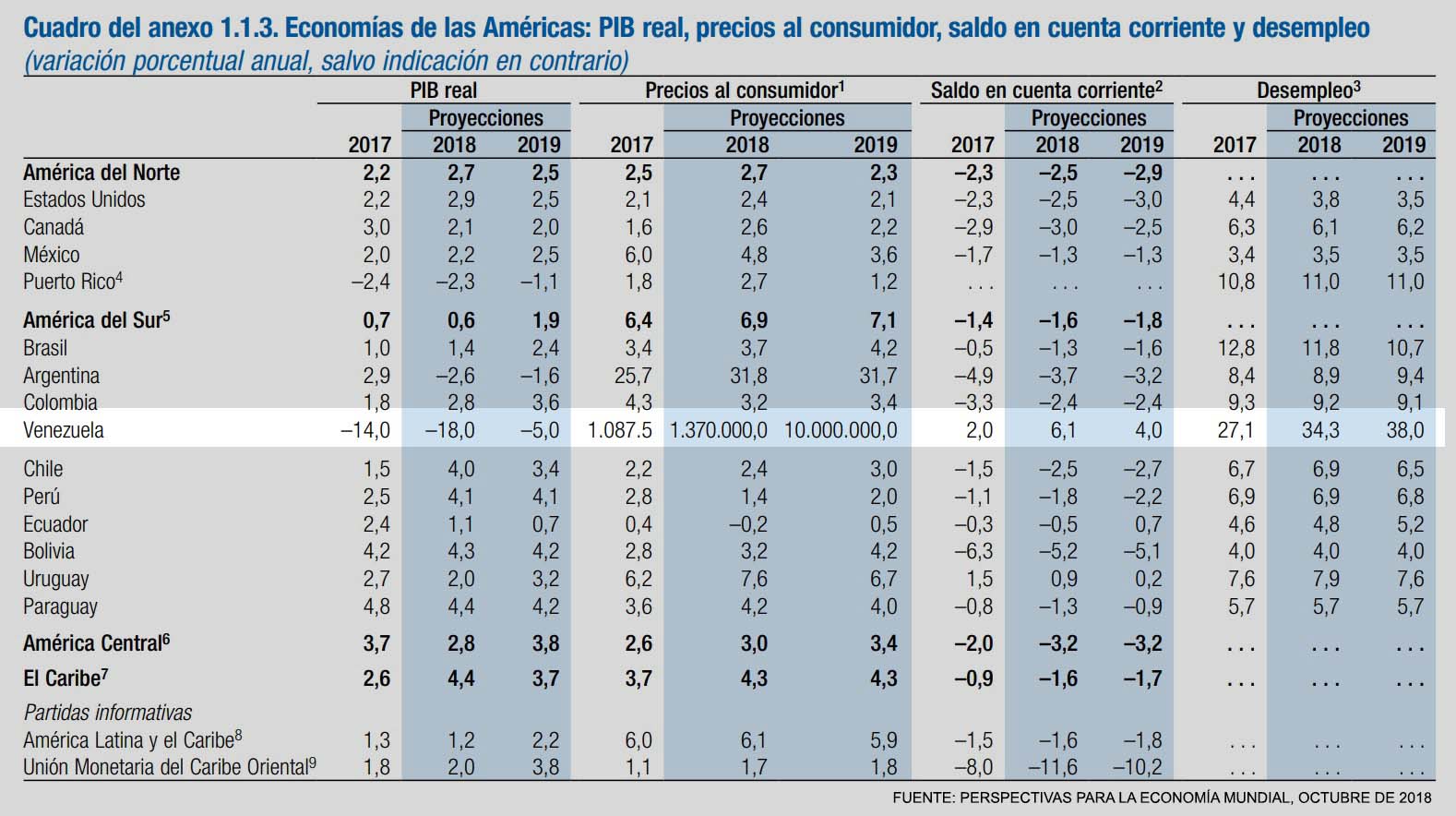 “Por quinto año consecutivo, la economía de Venezuela sigue deteriorándose, tras la caída del 14% registrada en 2017. Las proyecciones sugieren una reducción del PIB real de otro 18% en 2018 y del 5% en 2019, provocada por el desplome de la producción de petróleo y la inestabilidad política y social”, sostiene el documento del FMI,