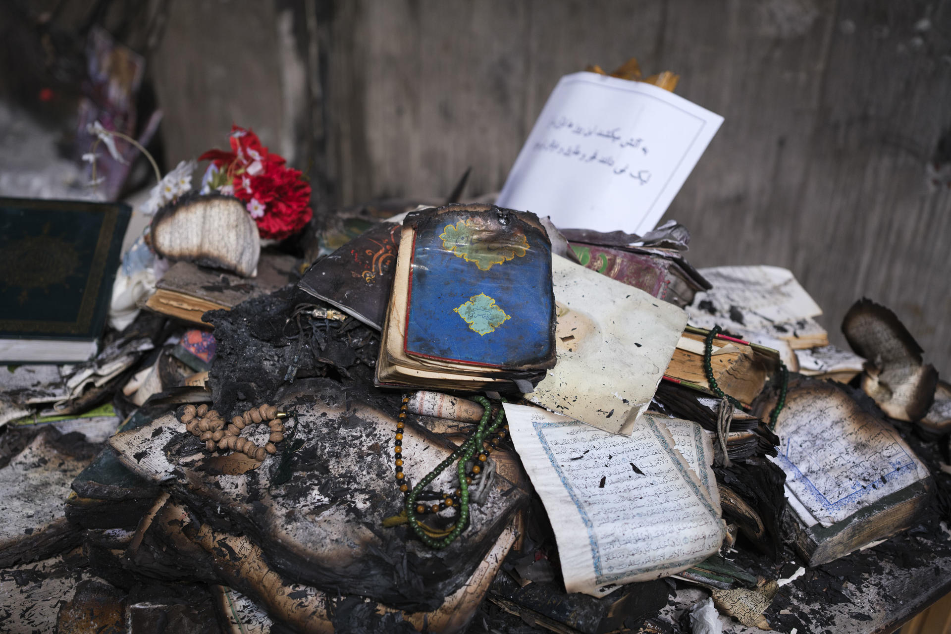 Coranes quemados de la mezquita Beheshti, del oriental barrio de Tehranpars, durante las protestas que han sacudido el país en las últimas semanas. EFE/Jaime León