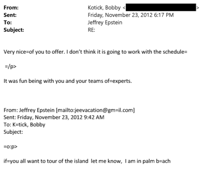 Con el paso de los años Epstein habría mostrado interés en este tipo de sistemas, ya que entre los mensajes que intercambiaba con Kotick, este último recibió una invitación a la isla para conversar en 2012.