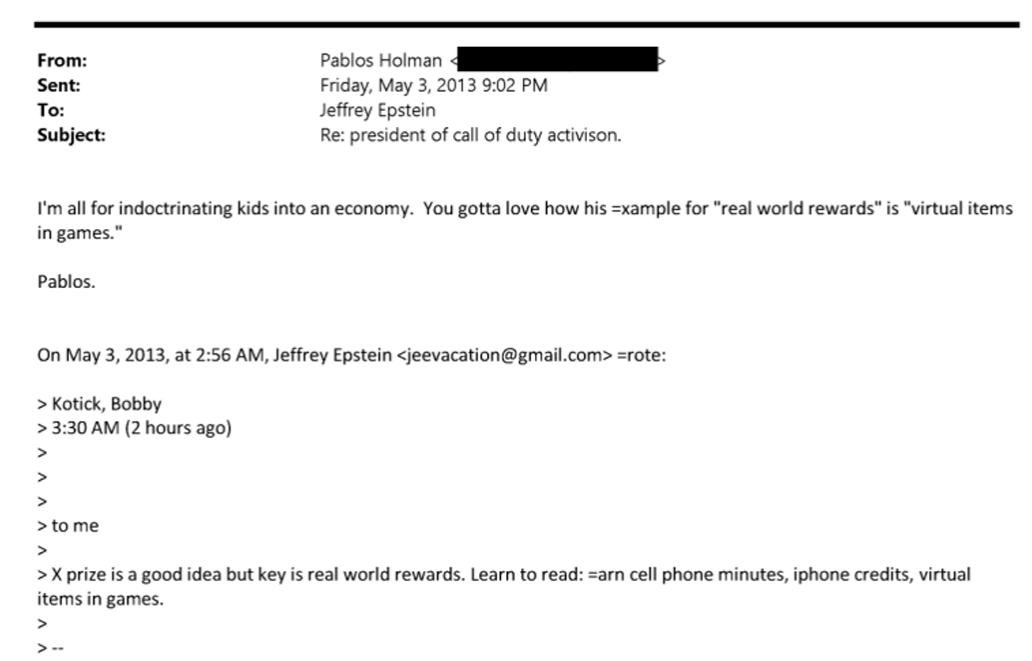 En la discusión acerca de generar dinero en videojuegos, Kotick respodía a Epstein: “Los premios de este tipo son una buena idea, pero la clave está en ofrecer recompensas tangibles. Aprender a leer debería tener beneficios concretos, como minutos de celular, créditos para iPhone u objetos virtuales en juegos”.