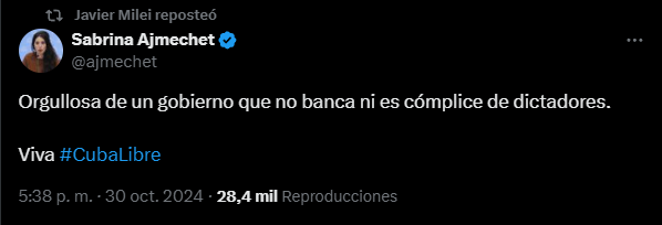 En específico, se trata de un repost de la diputada argentina Sabrina Ajmechet, quien se describe en la mencionada red como fundadora del Foro Argentino Contra el Antisemitismo y presidenta de la comisión de Derechos Humanos de la cámara trasandina.