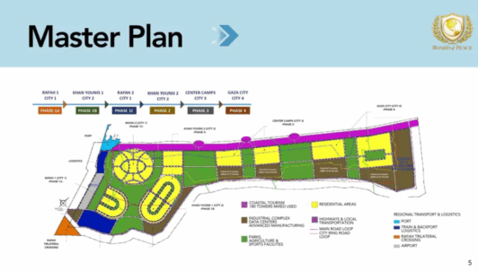 “Nueva Gaza” será un centro industrial, con el objetivo de lograr un empleo pleno del 100 %, dijo Kushner. Imágenes generadas por computadora sugieren una metrópolis que guarda un gran parecido con ciudades del golfo Pérsico como Doha y Dubái, con relucientes alojamientos y oficinas cerca del agua.